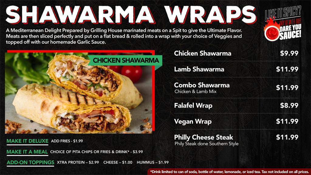 Our MenuBrowse Our MenuOur Food is always fresh, hot and delicious! Loved By Charlotte, NC!Best Shawarma Wraps, Kabobs, Gyros and Platters!!Come on in and taste for yourself!To download and print our menu, click here Order Online To download and print our menu, click here